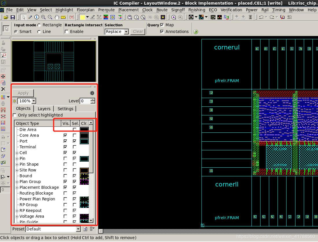 (a)Vis列:取消选中除单元格以外的所有内容。仅显示标准、宏和输入输出焊盘单元( standard-, macro- and IO padcells )。