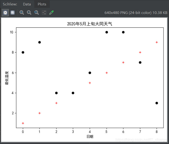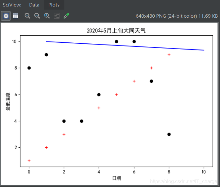 其中最高气温影响因素日期用 + 表示,最低气温用 · 表示。