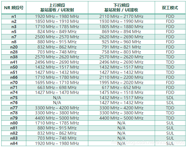 5G NR的频段号以“n”开头,与LTE的频段号以“B”开头不同。目前3GPP指定的5G NR频段如下: