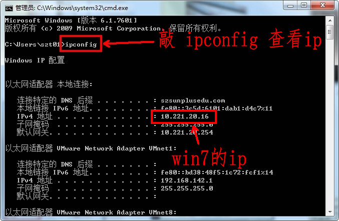 3)保证 xshell 所在主机( 这里为win7 ) 和 ubuntu( 这里为虚拟机 ) 相互能平通,因为ssh远程连接是通过网络连接的,如果网络都不通,就无法连接。
