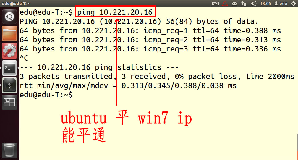 c) 在虚拟机ubuntu终端平win7的ip: ping 10.221.20.16