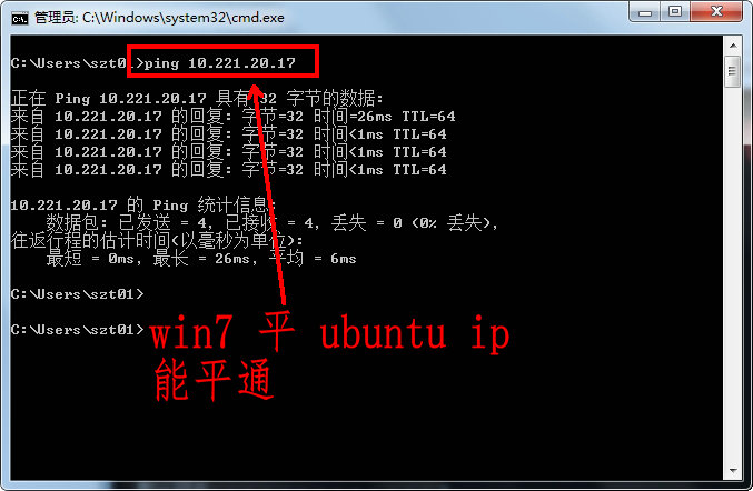 d) 在PC机win7终端平ubuntu的ip: ping 10.221.20.17