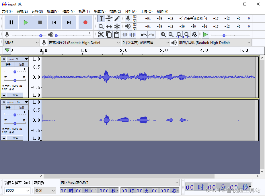 上面一行是未处理的原始音频数据,下面一行是噪音处理后的音频数据,处理的相对还是比较干净的。