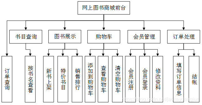 根据网上图书商城前台的特点,可以分为书目查询、书目展台、购物车、会员管理、收银台、订单查询及图书商城公告6个部分,其中各个部分及其包括的具体功能模块如图4-1所示。