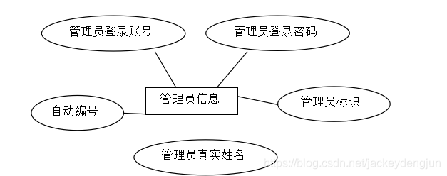 管理员信息实体包括自动编号、管理员登录账号、管理员登录密码、管理员真实姓名及管理员标识属性。在管理员标识信息中,1代表总管理员(在本系统中总管理员只存在一个,他的登录账号为222,密码为222,0代表普通管理员。管理员信息实体的E-R图如图5-1所示。