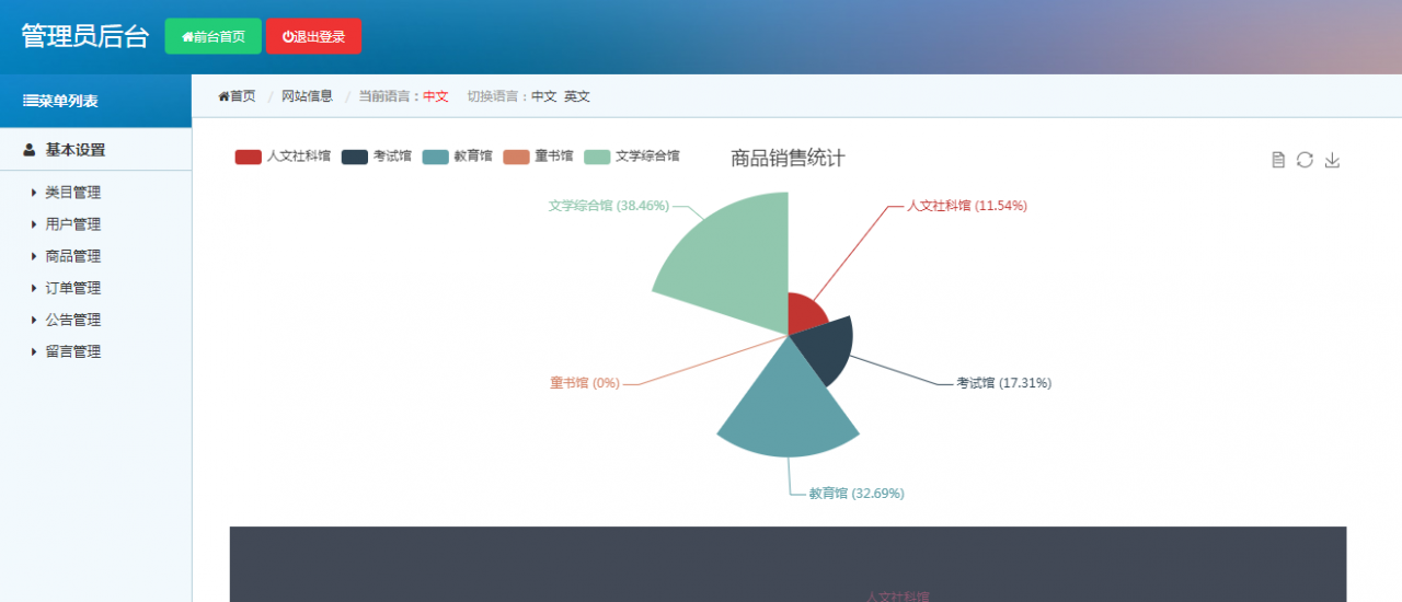 4.管理员后台登录后首页可以查看销售统计图,可以管理添加商品一级分类和二级分类,可以添加修改商品信息,可以查询用户订单发货,可以发布管理公告,可以查看删除用户留言。