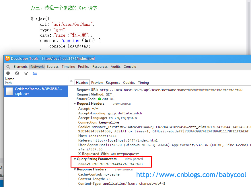 通常我们需要传递参数只需要指定ajax方法的data属性即可:data:{"name":"赵大宝"}