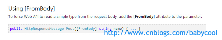 MSDN中关于Web API 中 [FromBody] 的介绍: Parameter Binding in ASP.NET Web API | The ASP.NET Site
