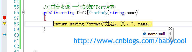 通过调试,我们可以看到,后台Action 中接收到的name值为null。