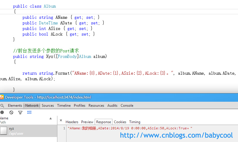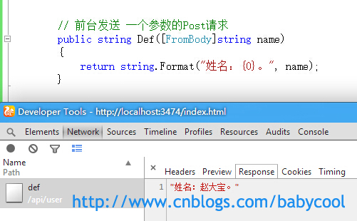 可以看到,在post请求中,方法的参数必须要用 [FromBody] 属性来修饰才可以, [FromBody] 就告诉Web API 要从post请求体重去获取参数的值。