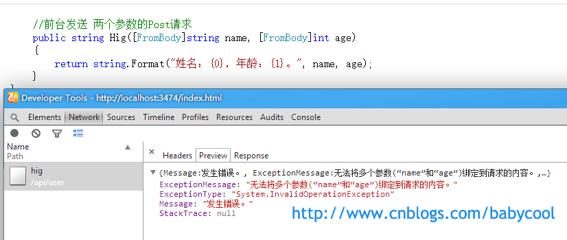 也就是说,[FromBody] 修饰的参数只能有一个。我们需要对传递的多个参数进行封装才行。