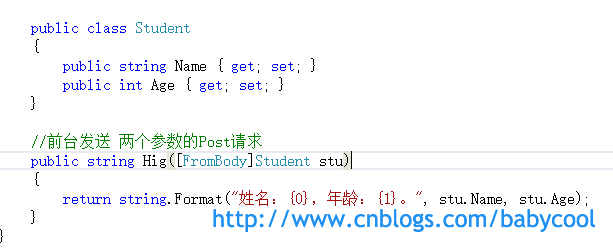 即在Action 方法中我们需要使用 [FromBody] 属性标签来标明属性。