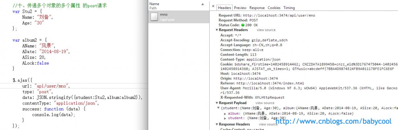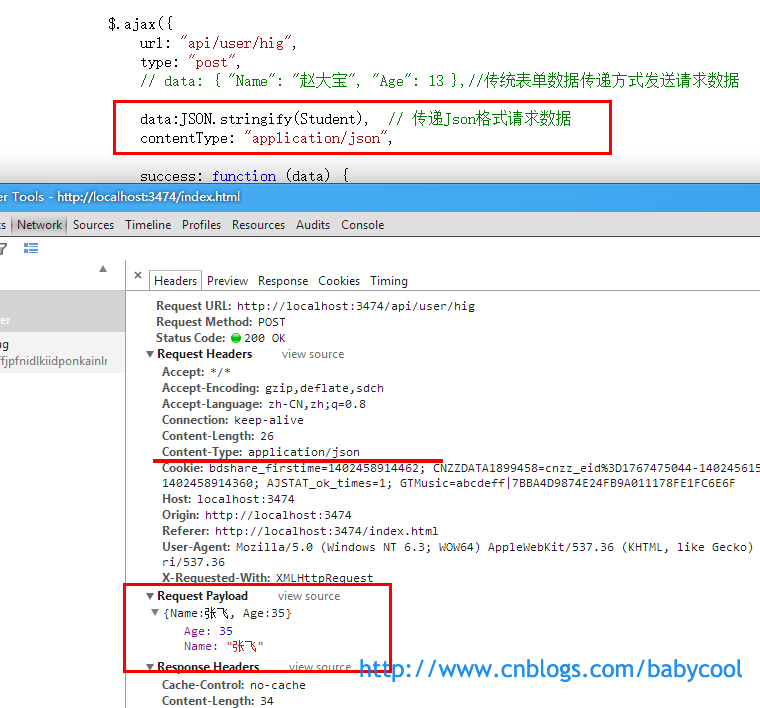 这里,我们通过上面图片中的请求头数据可以看到,Form Data 的格式是 key=value&key=value 这种表单数据格式 Name=%E8%B5%B5%E5%A4%A7%E5%AE%9D&Age=13 ,我们平时使用的比较多的一般为json格式。 这里,我们使用 JSON.stringify() 来序列化数据。