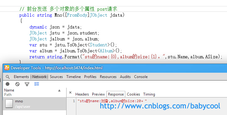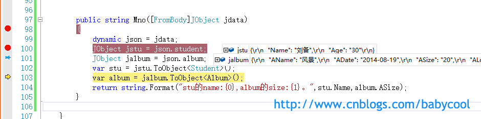有时候我们还会遇到需要传递多个不同对象参数的情况,对于这种特殊的情况在 Json.Net 中为我们提供了一个 名为 JObject 的通用对象容器,我们可以通过 .对象名 的方式来动态的遍历参数里面的属性的值,然后动态的转换和json类型中对应的属性类型。