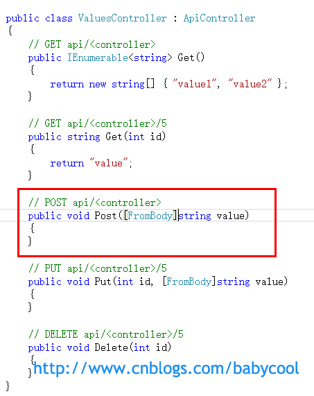 这里我们可以看到,默认创建的Controller控制器类中,对于Post请求的Action方法都自带了 [FromBody] 属性。 现在不用我说,你也已经知道为什么 它会为参数默认带一个 [FromBody]属性吧!