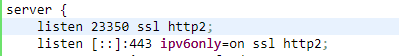 首先第二行 listen 23350 就是监听端口号为23350的ipv4端口,ssl指的是使用tls协议加密。 http2指的是允许使用新一代(其实还有quic的http3,我没部署,因为我被整自闭了)的http2技术进行高效连接。