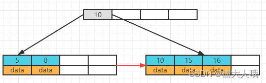 为什么要链接成链表形式 因为 比如说 在数据库 查询一个 8-15的数据 我们就可以先找到 5 然后根据链表找到 15 一次性就找全了 而不连接的话 我们第一次 只可以找到 5 ,8 这两个数据 然后 在从新找到 10 15 这两个 因此链接的话 方便查询效率