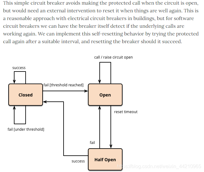 - 熔断半开:部分请求根据规则调用当前服务,如果请求成功且符合规则则认为当前服务恢复正常,关闭熔断