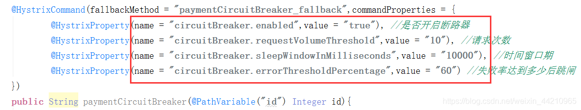 - 当失败率达到一定的时候(默认10秒内超过50%的请求次数)