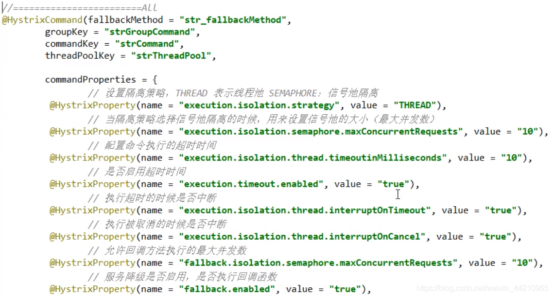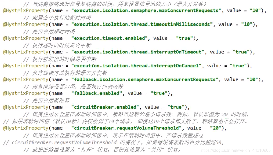 - 请求总数阀值:在快照时间窗内,必须满足请求总数阀值才有资格熔断。默认为 20,意味着在 10 秒内,如果该 hystrix 命令的调用次数不足20次,即使所有的请求都超时或其他原因失败,断路器都不会打开。