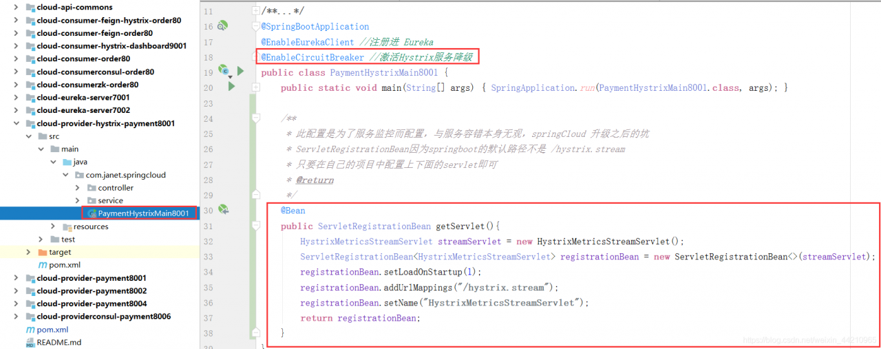 * ServletRegistrationBean因为springboot的默认路径不是 /hystrix.stream