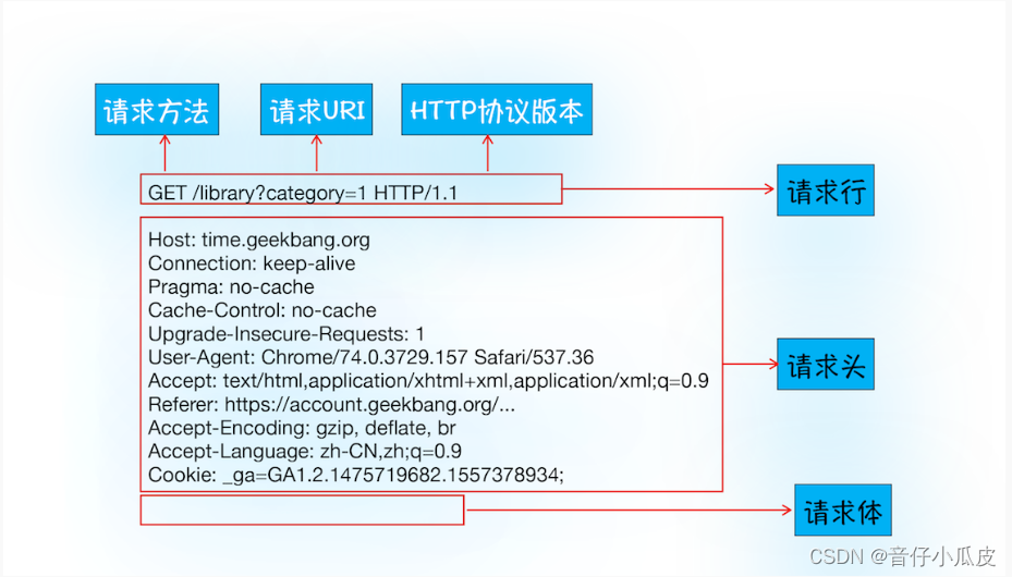 - 首行“请求行”为基本的请求信息,包括请求方法(get post put等)、请求URL和HTTP 协议版本。