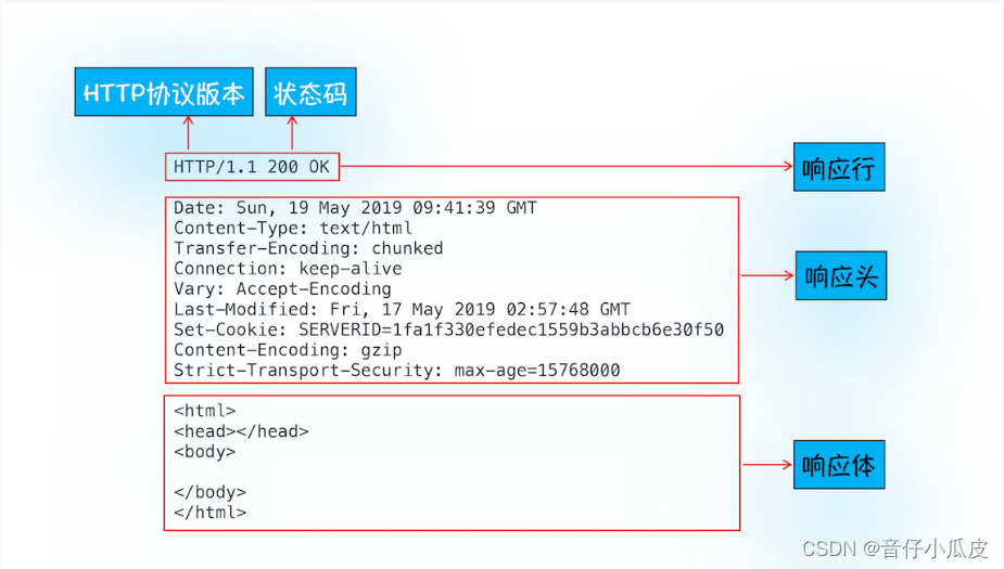 - 响应头:响应头用于指示客户端如何处理响应体,告诉浏览器响应的类型、字符编码和字节大小等信息。