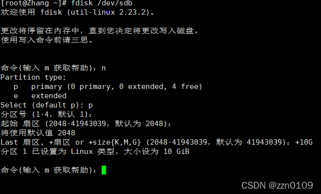 fdisk {磁盘设备} 回车后进入磁盘分区的配置
