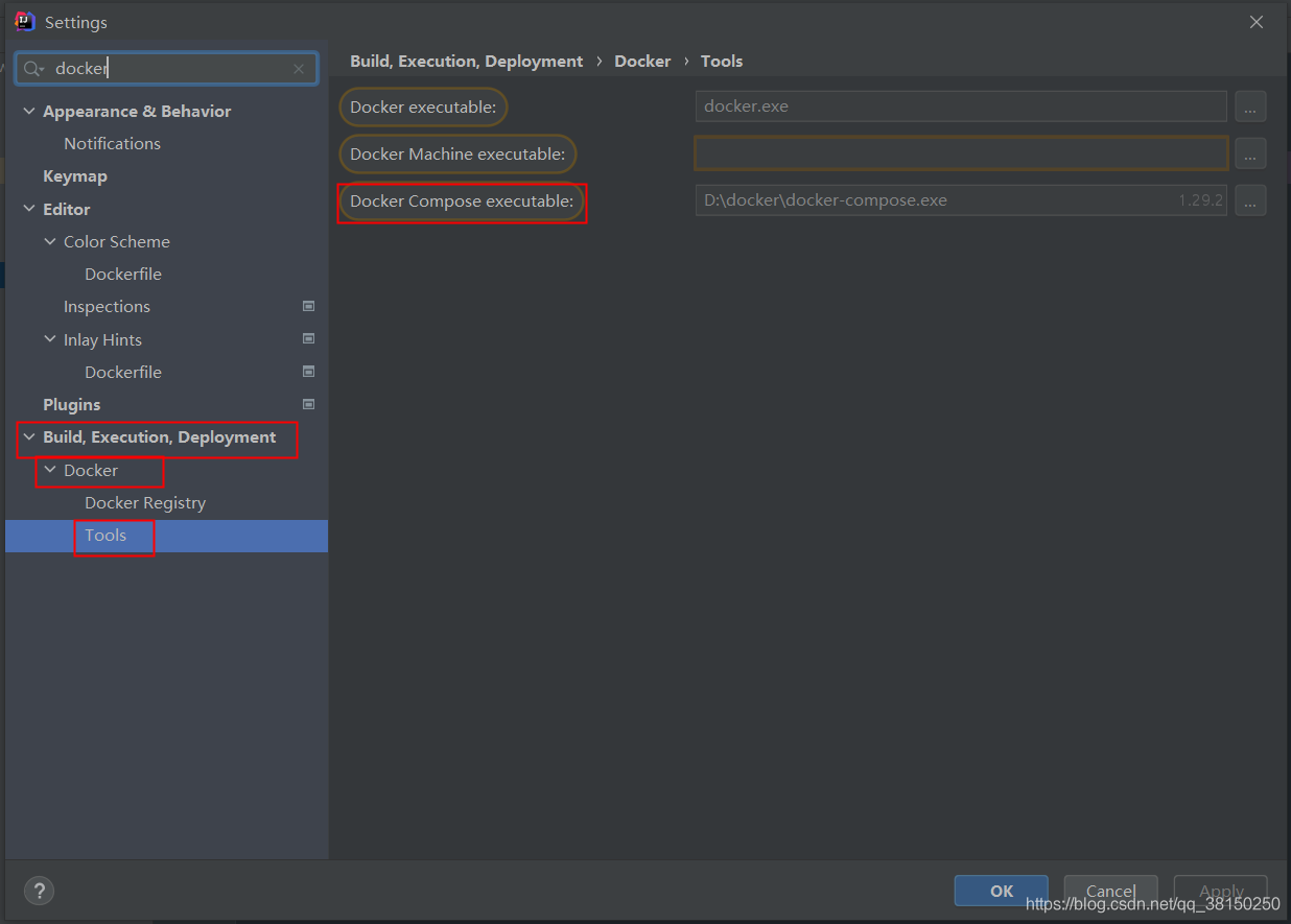 点开docker插件相关配置,果然可以配置 docker-compose 可执行文件路径