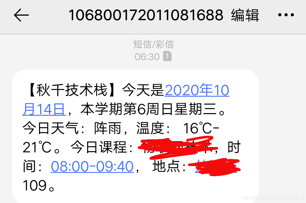 功能实现:如果当天有课,在当天早上6点30以短信的形式自动发送课表至手机