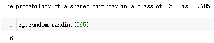 print('The probability of a shared birthday in a class of ', numstudents, ' is ', prob)