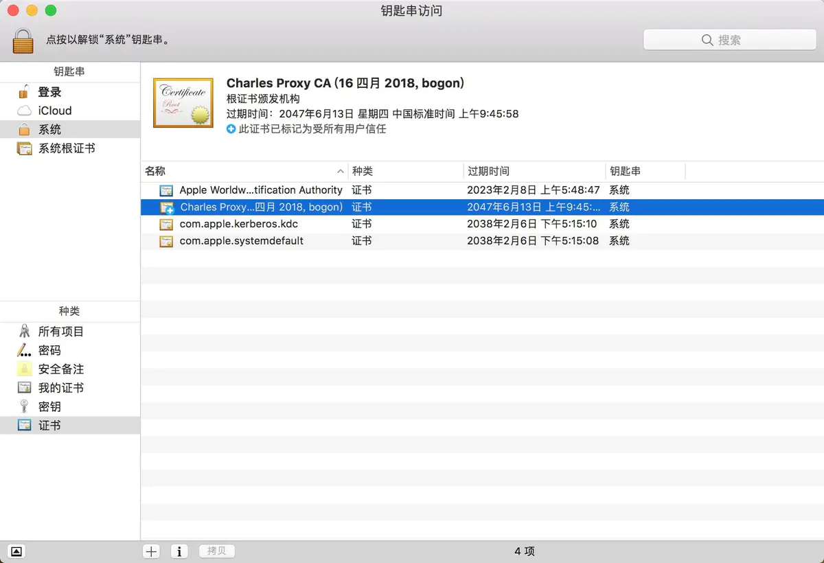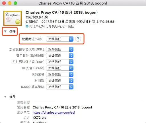 双击证书,弹出证书详细界面,点击『信任』选项,然后将所有设置为始终信任,如图: