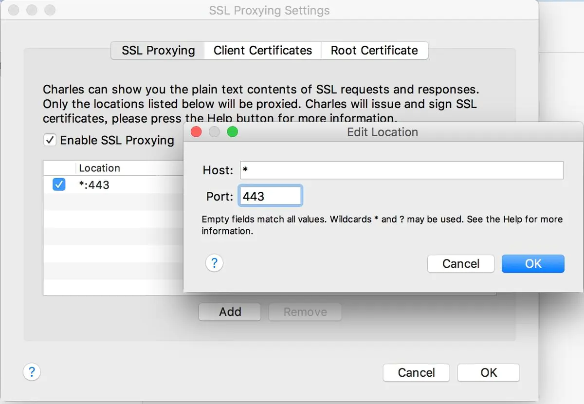 2.勾上启动SSL代理,并添加一个抓取规则,比如这里加上一个抓取所有https(443端口)的请求: