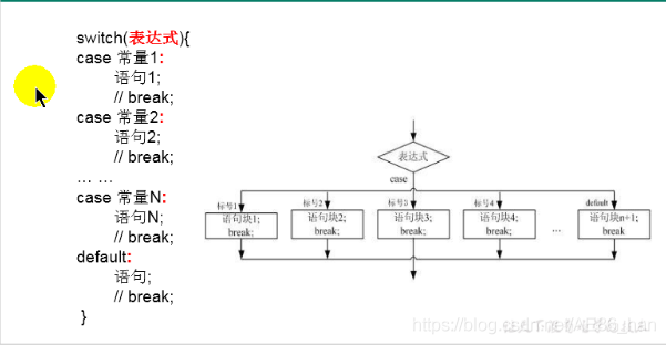 switch(表达式){ //这里的表达式并非是一个条件表达式,而是一个常量case 常量1: