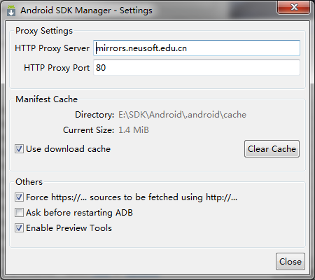 在『Android SDK Manager - Settings』窗口中,在『HTTP Proxy Server』和『HTTP Proxy Port』输入框内填入上面镜像服务器地址(不包含http://,如下图)和端口,并且选中『Force https://... sources to be fetched using http://...』复选框。设置完成后单击『Close』按钮关闭『Android SDK Manager - Settings』窗口返回到主界面;