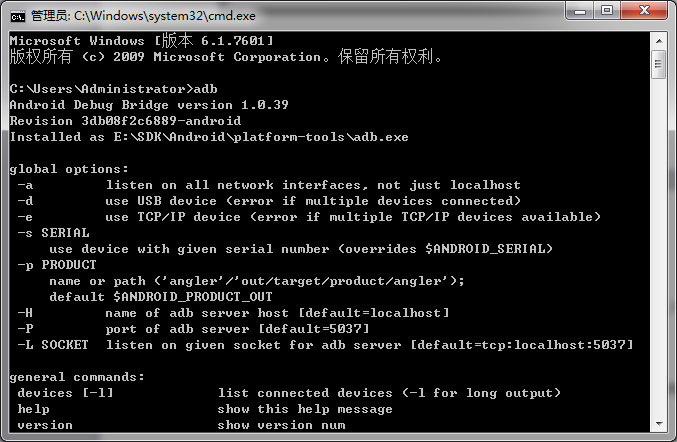 ③、检测是否配置成功。打开命令行窗口,输入adb。出现如下图所示内容则配置成功: