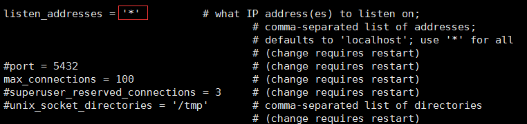 listen_addresses默认是注释掉的,打开即可,修改默认的listen_addresses=‘localhost’为listen_addresses='*'