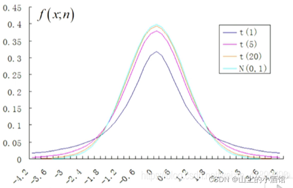 设随机变量X~ N(0,1)(标准正态分布),Y~x2 (n)(自由度为n的卡方分布),且X与Y相互独立,则称随机变量 服从自由度为n的t分布,t分布在自由度较低时相对标准正态分布表现更柔和(矮胖)。记为: