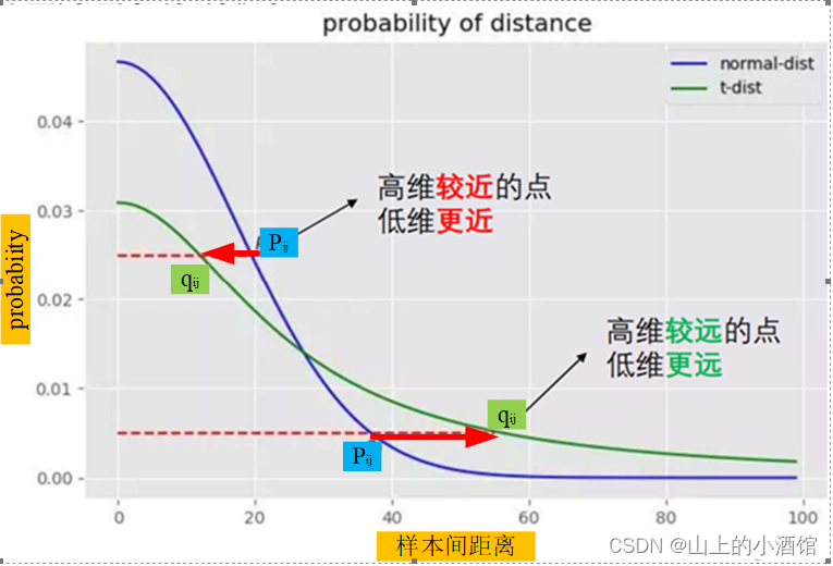 使用t分布后,在正态分布中距离较小的点,可保持相同的概率在t分布中获得更小的距离(拉近高维空间中距离较近的点)。在正态分布中距离较大的点,可保持相同的概率在t分布中获得更大的距离(排斥高维空间中距离较远的点)。