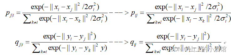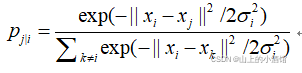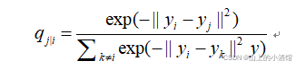 目标:yi对应xi投影到低维空间,调整yj使得KL散度(可看做损失函数)最小,即低维空间与高位空间的位置分布尽可能一致。