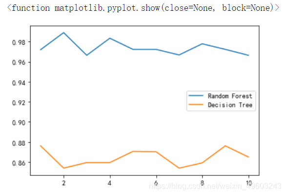 clf_1.append(clf_s)plt.plot(range(1,11),rfc_1,label="Random Forest")