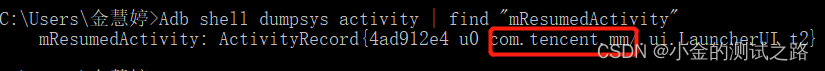 Adb shell dumpsys activity | find “mResumedActivity” 以Com开头,到斜杠前面的部分为止即为包名,
