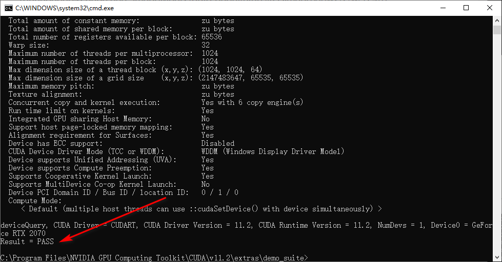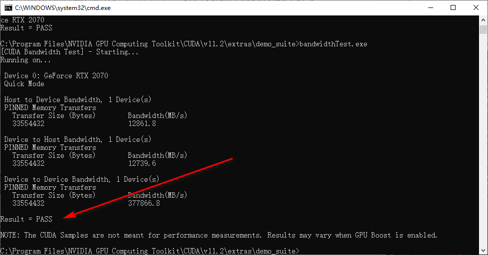 可以运行测试文件,进一步确认CUDA的安装结果,在CUDA的安装路径(也就是上文中添加的环境变量的位置,笔者这里没有选择默认是C:\Program Files\NVIDIA GPU Computing Toolkit\CUDA\v11.3,所以你的应该也是在这个位置),在C:\Program Files\NVIDIA GPU Computing Toolkit\CUDA\v11.3\extras\demo_suite路径下开一个命令行执行deviceQuery.exe和bandwidthTest.exe程序,看到最后的结果是PASS就表示环境可以用,如果是Fail说明环境还是有点问题,需要查一下问题