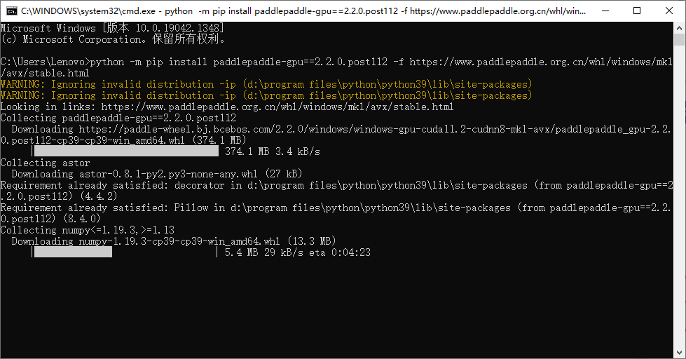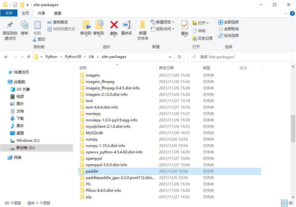 安装完成后是这样的,并且在Python包路径中能够找到paddle和关联下载的包
