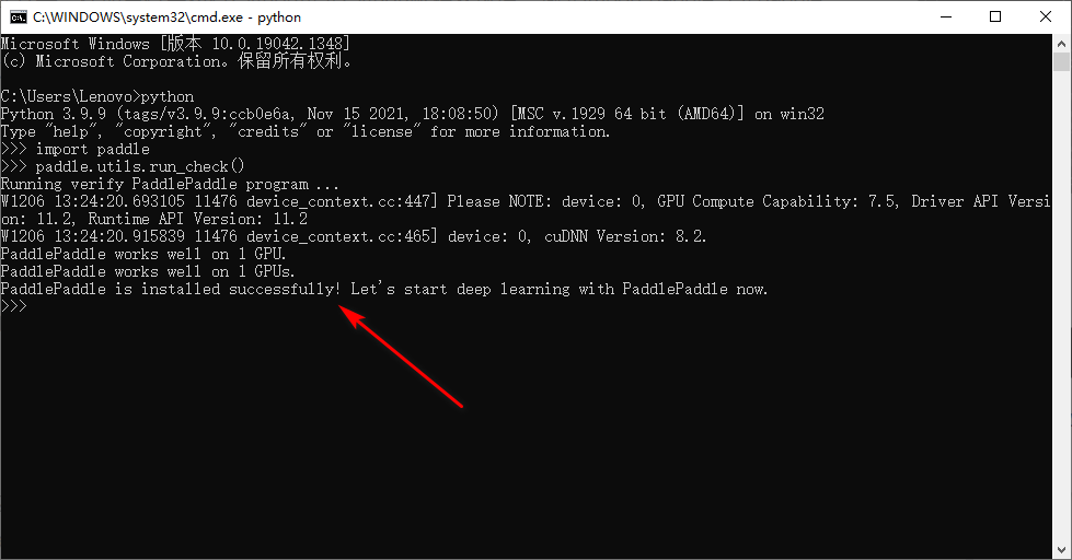 下面验证安装,在命令行中执行Python进入Python解释器环境,输入import paddle导入paddle包,输入paddle.utils.run_check()进行校验,如果出现PaddlePaddle is installed successfully!说明paddle环境能正常使用