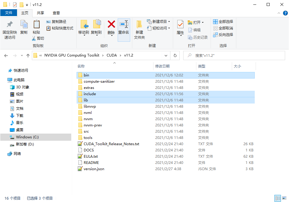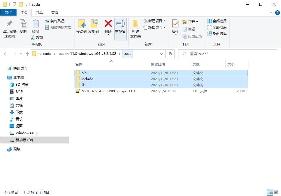将cuDNN压缩包解压出来,将里面的(bin/include/lib)3个文件夹拷贝到CUDA的安装目录中,CUDA的安装目录中本来也有这3个文件夹,其实就是合并操作,笔者操作时并没有提示重复文件覆盖,也就是说合并并不会有文件冲突