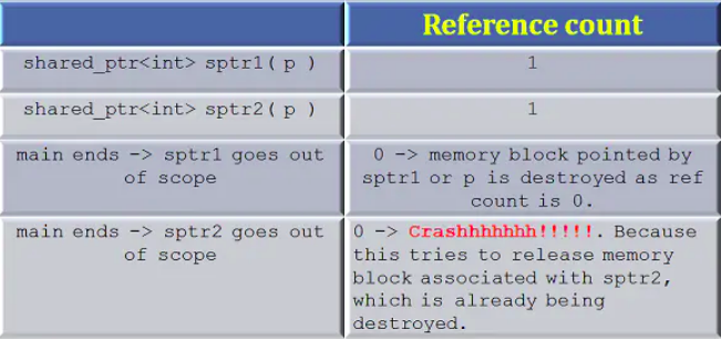 void main( ) { int* p = new int; shared_ptr<int> sptr1(p); shared_ptr<int> sptr2(p); }上述代码出现了一个错误,因为两个来自不同组的shared_ptr指向同一个资源