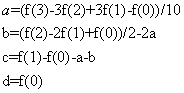 function re=cubicInterpolate(p,x) p=double(p); % re=p(2) + 0.5 * x*(p(3) - p(1) + x*(2.0*p(1) - 5.0*p(2) + 4.0*p(3) - p(4) + x*(3.0*(p(2) - p(3)) + p(4) - p(1)))); a=(p(4)-3*p(1)+3*p(2)-p(1))/10; b=(p(3)-2*p(2)+p(1))/2-2*a; c=p(2)-p(1)-a-b; d=p(1); re=a*x^3+b*x^2+c*x+d; end