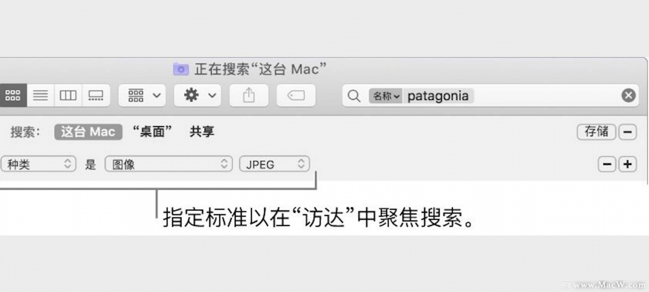 【提示】您可以存储搜索以便再次使用。只需点按搜索栏下方的“存储”。您的搜索结果被存储为一个“智能文件夹”。若要快速访问“访达”边栏中的搜索结果,请确定“添加到边栏”已选定。请参阅创建或更改“智能文件夹”。