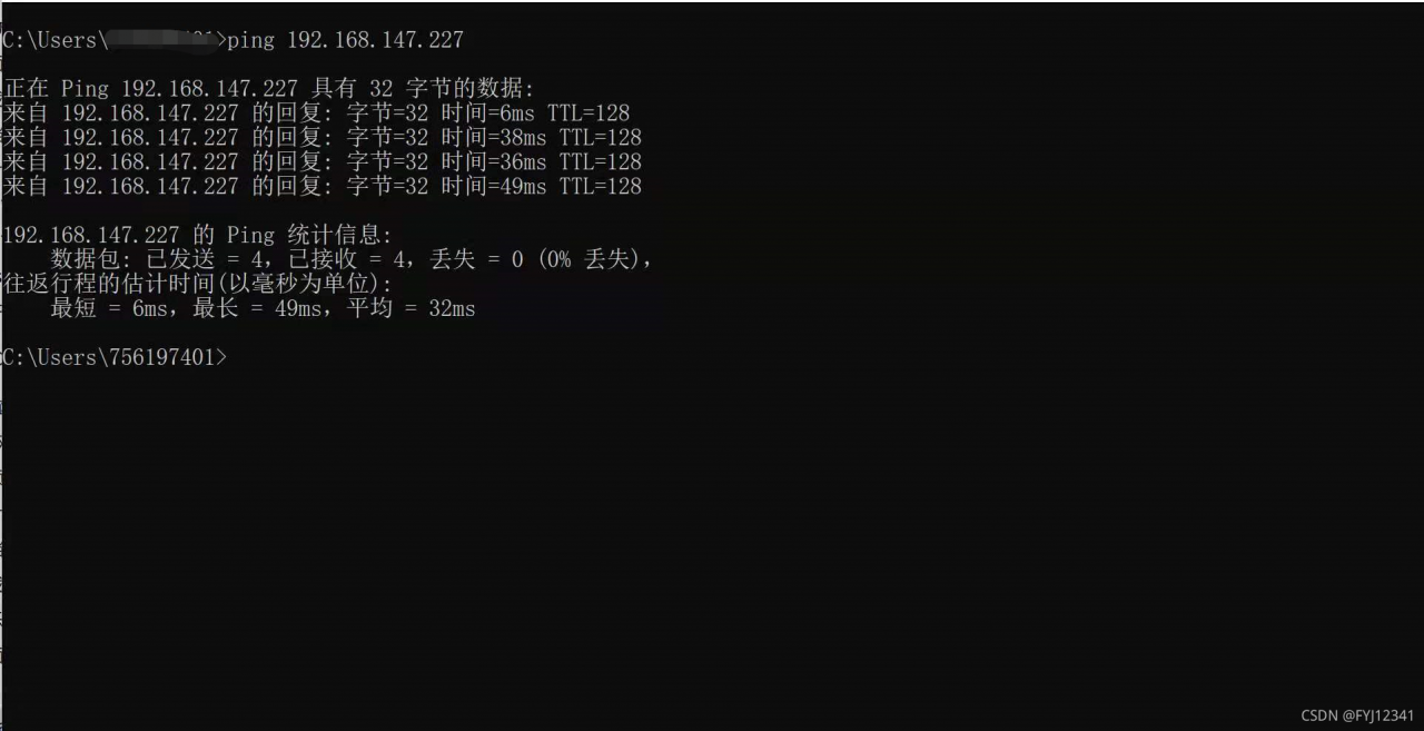 之后测试IP是否可以用ping连通,双方互相测试一下